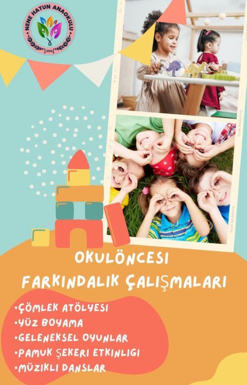 Okul öncesi farkındalık çalışmaları kapsamında okulumuzda çeşitli etkinlikler gerçekleştirilmiştir.Farkındalığın geliştirilmesi amacıyla ; atölye çalışmaları,geleneksel oyunlar,müzikli danslar ve ritim çalışmaları uygulanmıştır.Velilerin katılımıyla ebeveyn-çocuk etkinliklerine yer verilmiştir.Çömlek sanatı etkinliği ile evrensel bir sanat olan çömlekçilik üzerinde çalışılmıştır.palyaçolar,yüz boyama ve pamuk şekeri ile çocuklarımız doyasıya eğlenirken ailelere okul öncesinin önemi konusunda tasarlanan broşürler dağıtılmıştır.Farkındalık çalışmalarımıza destek olarak teşrif eden milli eğitim müdür yardımcısı Sayın Murat Günaydın'a,Temel Eğitim Şube Müdürü Sayın Mehmet Şirin Atlı'ya,komisyon üyesi anaokulu idareci ve öğretmenlerine sonsuz teşekkürlerimizle..